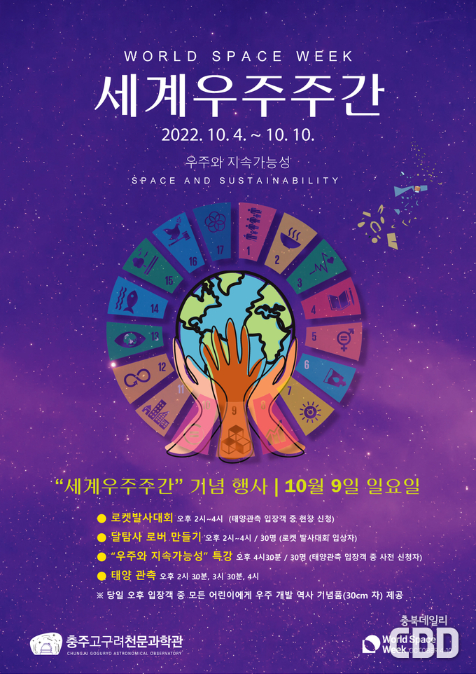 충주고구려천문과학관(관장 이태형)은 “2022 세계우주주간(World Space Week)”을 맞아 10월 9일(일) ‘우주와 지속가능성’을 주제로 다양한 프로그램을 운영할 예정이다.