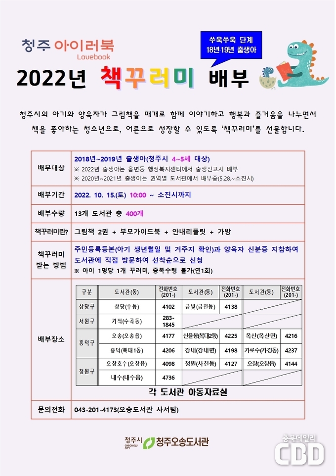 청주시 권역별 공공도서관 13개관(오송, 흥덕, 신율봉, 강내, 옥산, 가로수, 상당, 청원, 오창호수, 오창, 금빛, 내수, 기적의도서관)은 15일 오전 10시부터 3단계 ‘쑤욱쑤욱’ 책꾸러미 400부를 동시에 배부한다.