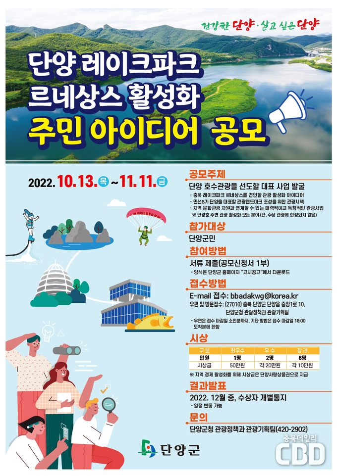 이번 공모전은 김영환 도지사 핵심 공약인 ‘충북 레이크파크 르네상스’의 성공적 추진을 위해 주민 공감대를 형성하고 창의적이고 다채로운 단양군민들의 아이디어를 발굴하기 위해 마련됐다.