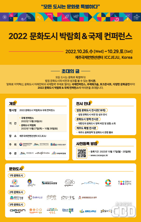 청주시와 청주시문화산업진흥재단 문화도시센터(대표이사 박상언, 이하 문화도시센터)는 오는 26일(수)부터 29일(토)까지 제주 국제컨벤션센터에서 열리는 [2022 문화도시 박람회‧국제컨퍼런스]에 참여한다고 밝혔다.