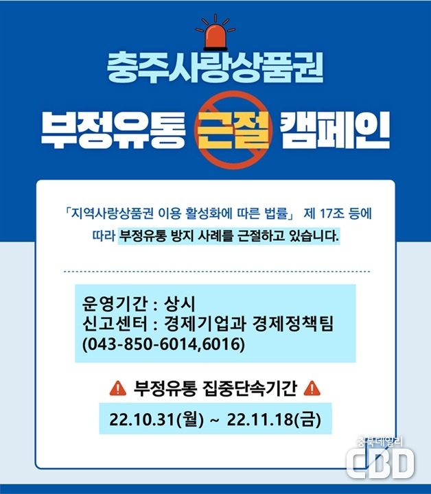 충주시는 ‘충주사랑상품권’ 부정유통 방지를 위해 31일부터 11월 18일까지 일제 단속을 진행한다.