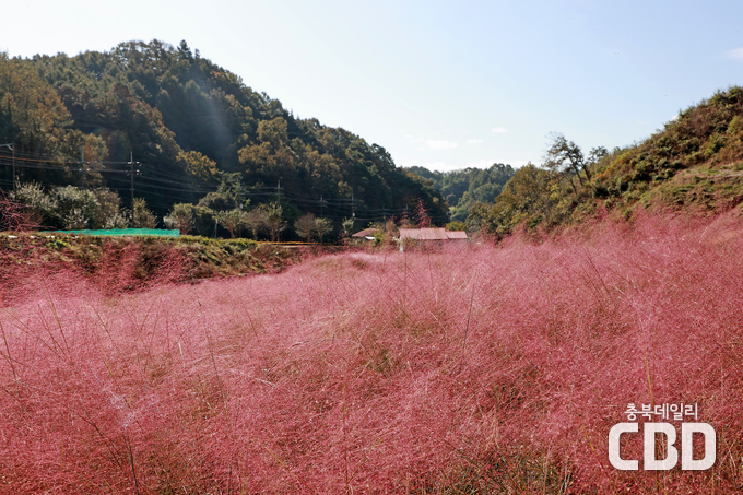 인근 괴산읍 서부리 39-9 일원에는 몽글몽글한 색으로 들판을 물들인 핑크뮬리가 자태를 뽐내고 있다.
