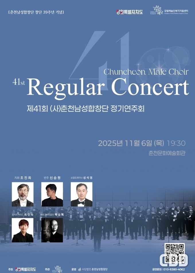 춘천남성합창단의 제41회 정기연주회가 오는 6일 목요일 오후 7시 30분, 춘천문화예술회관에서 열린다.