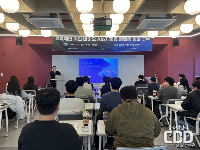 이번 교육은 과학기술정보통신부와 정보통신산업진흥원이 지원하고, 충청북도와 인천광역시가 공동으로 추진 중인 ‘지역 자율형 디지털 혁신프로젝트사업’의 일환으로 진행되었으며, 블록체인 기반 바이오 AIoT 물류 플랫폼의 실무 활용 역량 강화와 기술 이해도 제고를 목표로, 관련 기업 재직자 및 대학생 등 약 40명이 참여했다.
