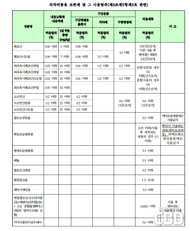 * 벤조산, 벤조산나트륨, 파라옥시벤조산메틸, 파라옥시벤조산프로필, 소르빈산, 소르빈산칼륨, 소르빈산나트륨