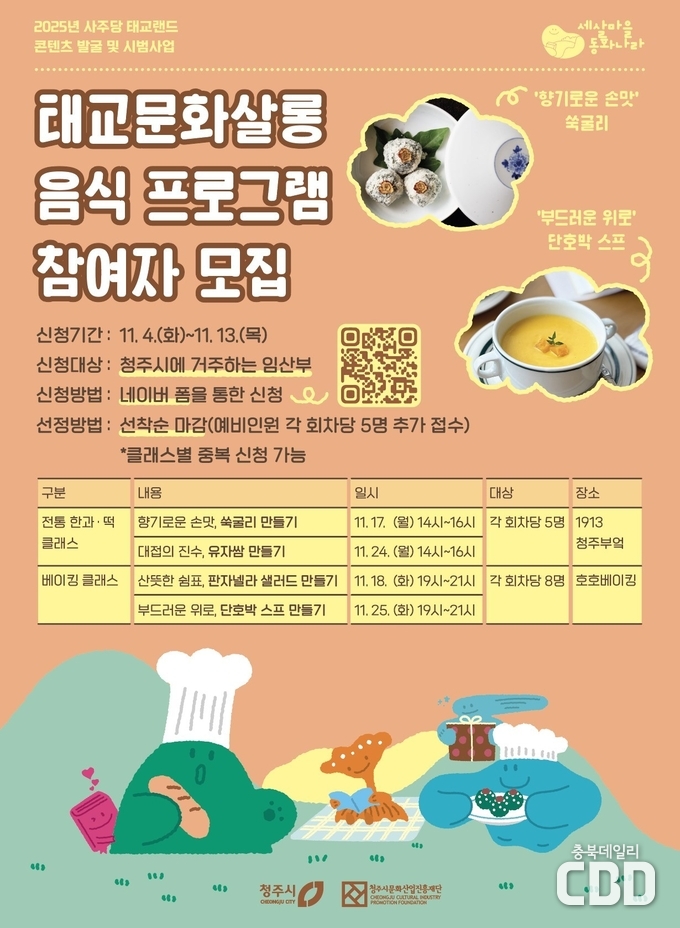 청주시와 청주시문화산업진흥재단(대표이사 변광섭, 이하 청주문화재단)은 오는 4~13일 청주문화재단 누리집에서 ‘태교문화살롱 음식프로그램’ 참여자를 모집한다.