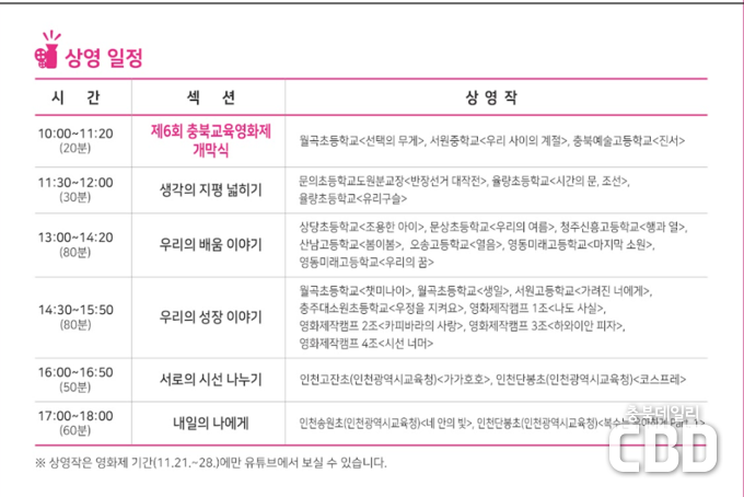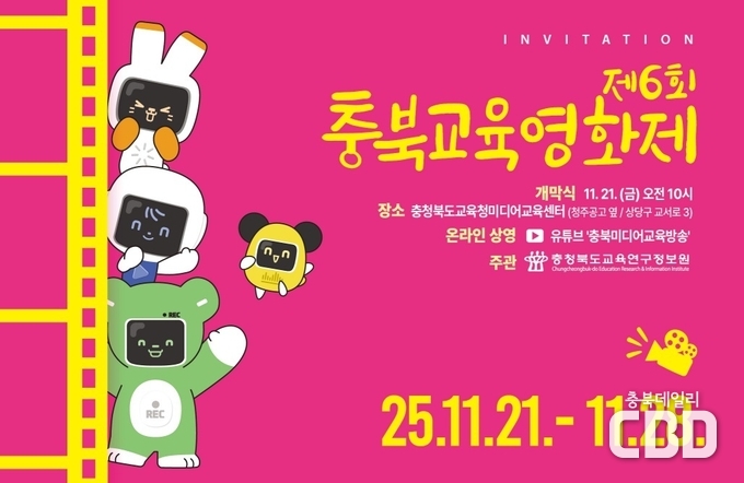 충청북도교육청 직속기관 교육연구정보원(원장 이찬동) 미디어교육센터는 오는 21일(금)부터 29일(토)까지 제6회 충북교육영화제를 개최한다고 밝혔다.