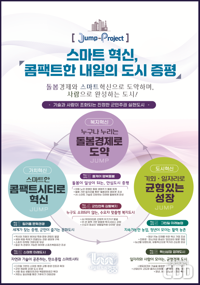 그가 제시한 Jump-Project의 ‘Jump’는 단순한 도약을 넘어 도시가 나아가야 할 세 가지 미래 방향으로 △스마트한 콤팩트 시티로 혁신(Jump) △누구나 누리는 돌봄경제로 도약(Jump) △기회·일자리로 균형있는 성장(Jump)이다.