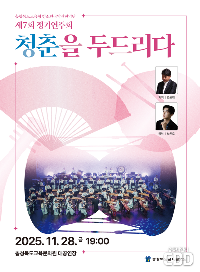 충청북도교육청 직속기관 교육문화원(원장 서종덕)은 28일(금) 저녁 7시, 충북교육청 청소년국악관현악단이 교육문화원 대공연장에서 제7회 정기연주회 <청춘을 두드리다>를 열었다고 밝혔다.