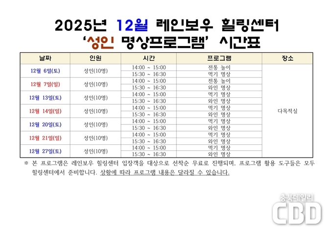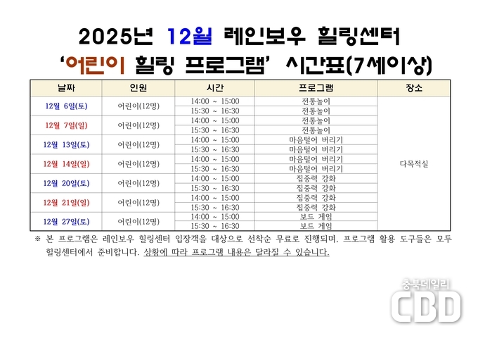 영동군 관계자는 “추운 겨울철에도 레인보우 힐링센터는 아이부터 어른까지 모두가 따뜻한 실내에서 여유와 휴식을 누릴 수 있는 공간”이라며 “앞으로도 군민과 방문객에게 더 가까운 힐링 명소가 될 수 있도록 다양한 체험 프로그램을 지속적으로 운영하겠다”고 말했다.