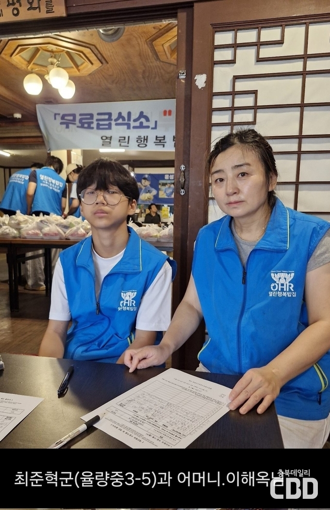 2025년초부터 최준혁(율량중3년)의 모자관계로 열린행복밥집에서 자원봉사로 참석하여 매주 몇시간씩 급식시설 청소와 배식에 참여하였다. 12년전 한국으로 귀화한 중국국적의 재중동포였다. 가족이 대한민국으로 어렵게 국적을 변경한것이다. 주인공은 외아들로 현재 율량중 3학년 재학중이며 어머니와 함께 무료급식 시설로 1여년 동안 자원봉사를 이어온 것이다.