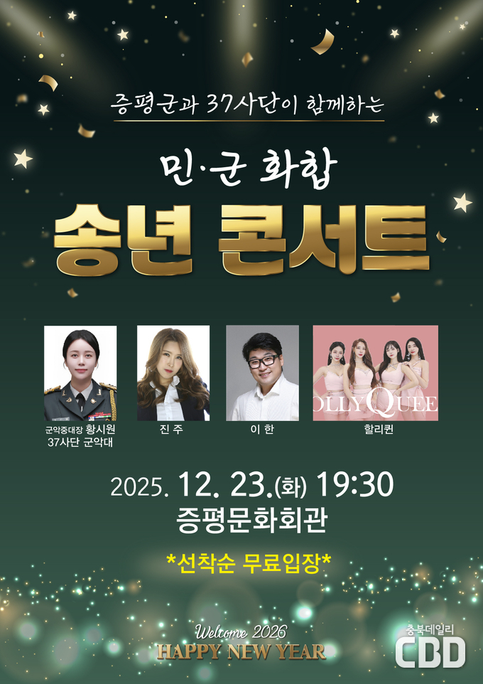 충북 증평군은 오는 12월 23일 오후 7시 30분, 증평문화회관에서 민과 군(軍이) 함께 어우러지는‘민·군화합 송년콘서트’를 개최한다.