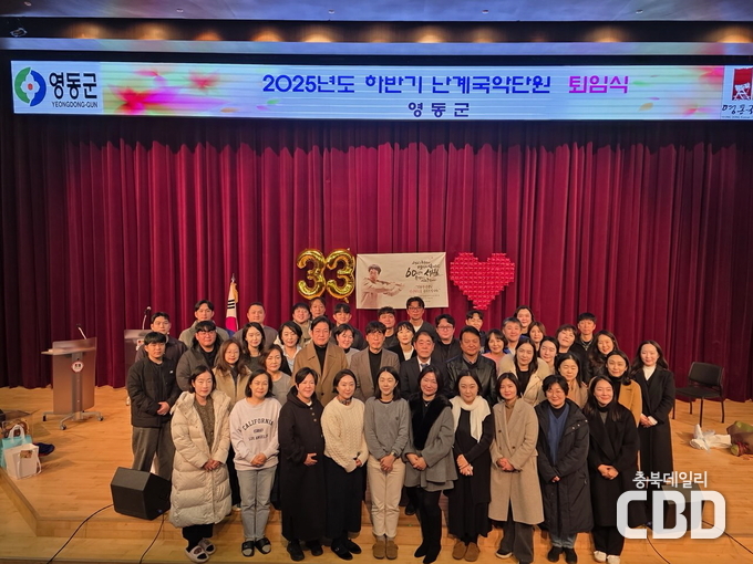 충북 영동군은 지난 17일 국악체험촌 우리소리관 공연장에서 ‘2025년 하반기 난계국악단 퇴임식’을 개최하고, 33년간 난계국악단에서 활동해 온 대금 연주자 김종찬 단원의 퇴임을 기념하는 뜻깊은 시간을 가졌다고 밝혔다.