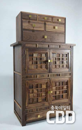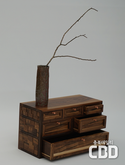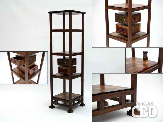 ‣ 작품명 : <사랑방가구> ‣ 조선시대 사랑방 가구 중, 이층책장과 단문갑을 북미산 월넛과 메이플을 이용해 제작 ‣ 나무의 색상차를 이용해 음과 양을 표현, 오랜세월 살아온 나무조각 하나하나를 활용해 시간적 흐름 조각 |