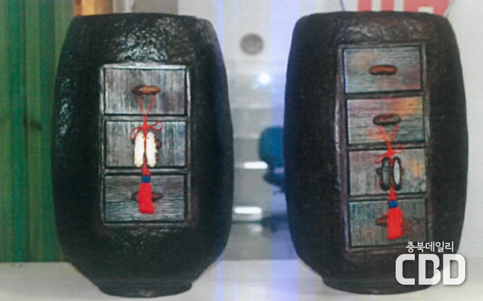 ‣ 작품명: <서랍품은 항아리> ‣ 항아리를 만든 후 그속에 서랍을 만들어 넣고 실용성을 더하도록 만든 장식을 겸한 지호종이 생활공예품 |