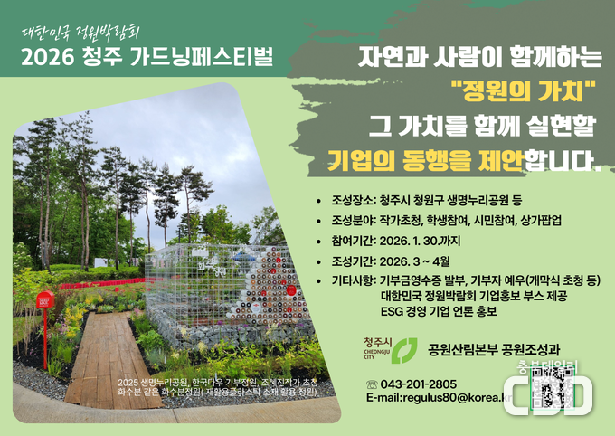 청주시는 정원문화와 정원산업 활성화를 위해 2026년 5월 생명누리공원에서 열리는 ‘대한민국 정원박람회 2026 청주 가드닝페스티벌’에 함께할 ESG 경영 기업을 모집한다고 22일 밝혔다.