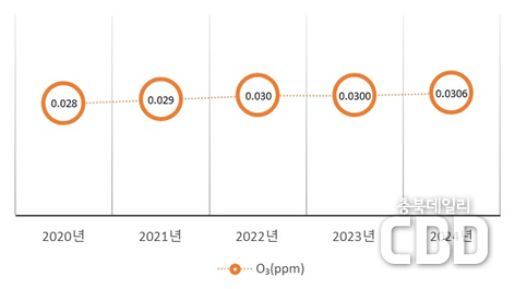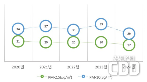 2024년 충북의 연평균 미세먼지(PM-10) 농도는 29 ㎍/㎥이고, 초미세먼지(PM-2.5) 농도는 17 ㎍/㎥로, 2023년 대비 각각 10 ㎍/㎥, 3 ㎍/㎥ 감소하였으며, 오존 농도만 0.0306 ppm으로 2023년 대비 소폭 증가했다.