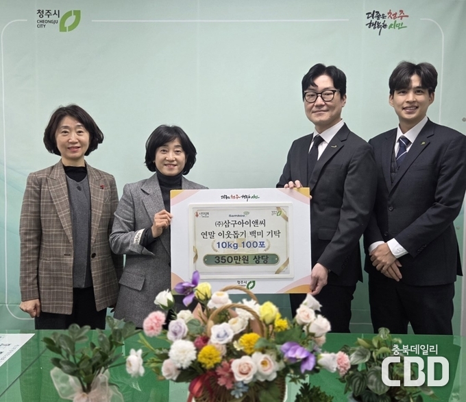 ㈜삼구아이앤씨(대표 김형규, 변상필)는 29일 청주시청을 방문해 연말 이웃돕기에 사용해 달라며 350만원 상당 백미(10kg) 100포를 기탁했다.