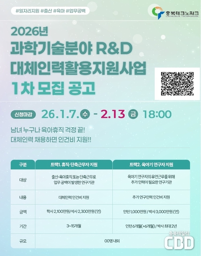 (재)충북테크노파크(이하 충북TP)는 한국여성과학기술인육성재단(이하 WISET)과 협약을 통해‘2026년 과학기술분야 R&D 대체인력 활용 지원사업’1차 모집을 1월 7일 부터 2월 13일까지 진행한다고 밝혔다.