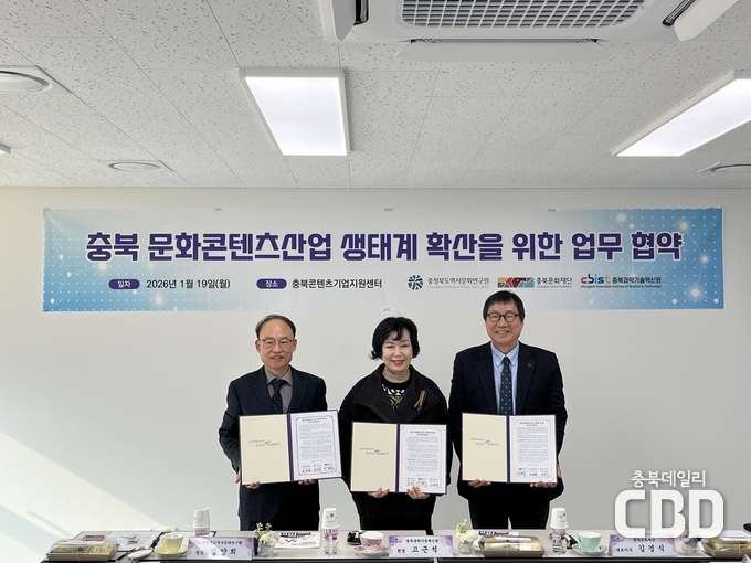 충북과학기술혁신원(원장 고근석, 이하 ‘충북과기원’)은 충북 문화콘텐츠산업의 체계적인 육성과 산업 경쟁력 강화를 위해 충청북도역사문화연구원(원장 김양희), 충북문화재단(대표이사 김경식)과 함께 19일 「충북 문화콘텐츠산업 생태계 확산을 위한 업무협약」을 체결했다고 밝혔다.