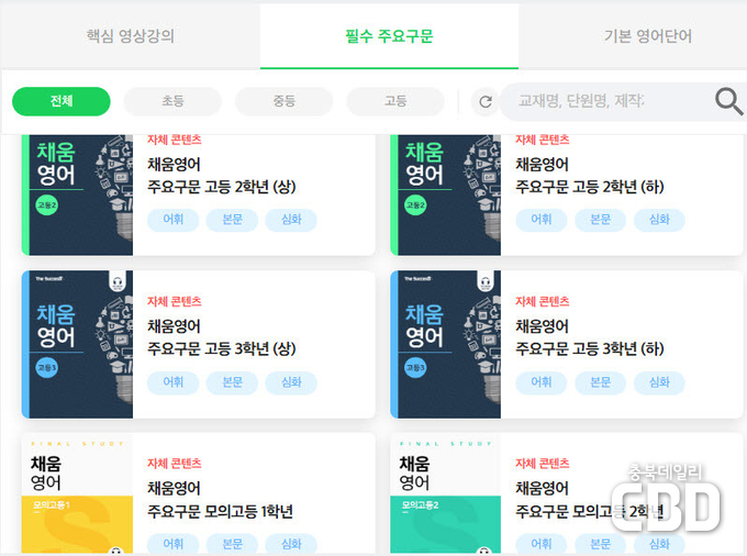 충청북도교육청(교육감 윤건영)은 다채움 플랫폼을 통해 초등 3학년부터 고등 3학년까지 지원하는 자기주도형 영어 학습 서비스 <채움영어>를 본격 운영하고 있다고 밝혔다.