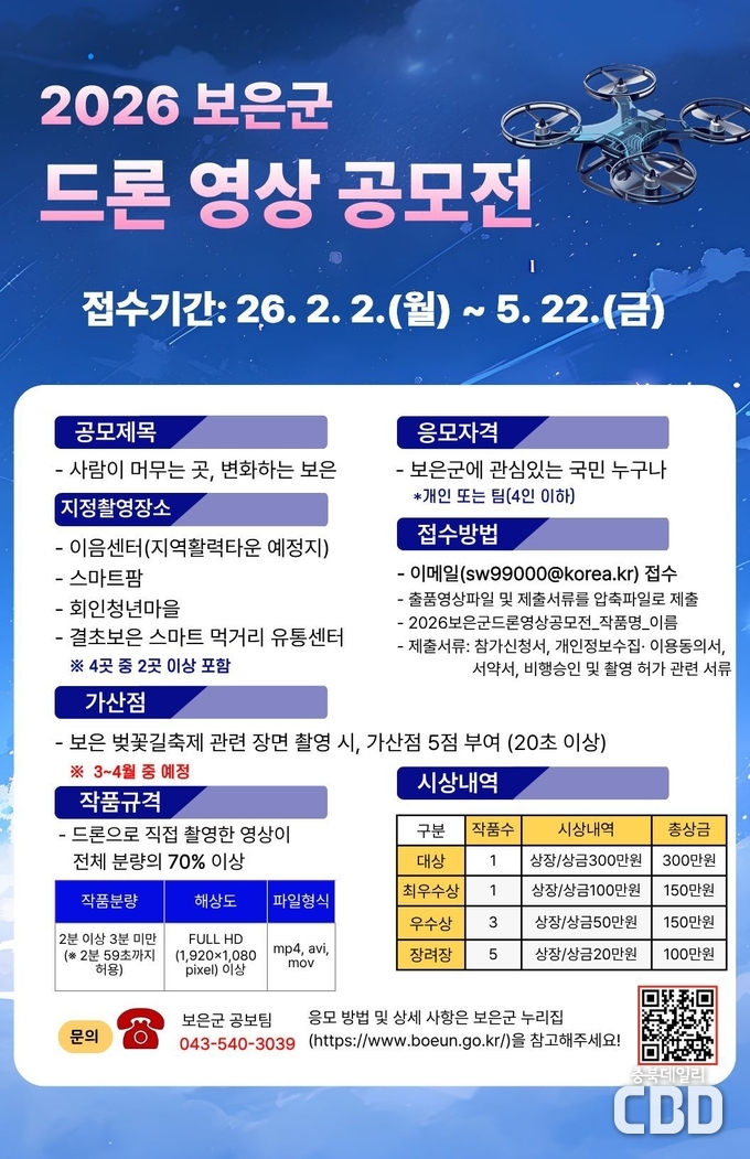 박기병 기획감사실장은 “이번 드론 영상 공모전을 통해 보은군의 변화하는 모습과 미래 비전을 참신한 시선으로 담아낸 콘텐츠를 발굴하고자 한다”며 “전국의 드론 촬영과 영상 제작에 관심 있는 분들의 많은 참여를 바란다”고 말했다.