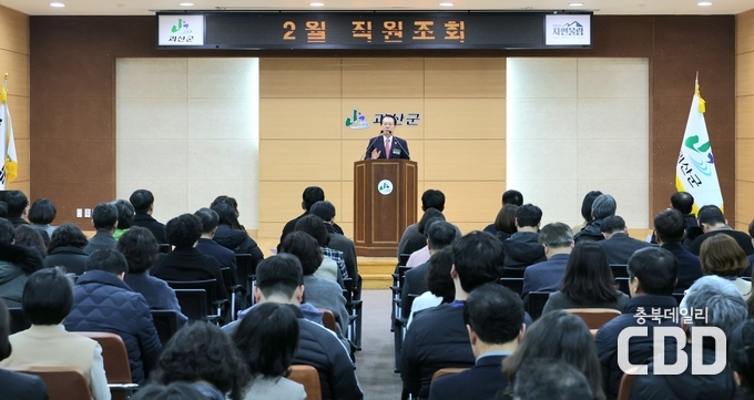 송인헌 괴산군수가 2일 군청 대회의실에서 열린 직원조회에서 주민과 밀접한 행정의 홍보 강화와 친절·책임행정 실천을 강조했다.