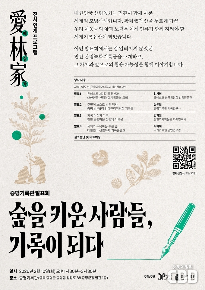 이재영 군수는 “산림녹화는 국가 정책과 주민의 헌신이 함께 만든 세계적 성과”라며 “이번 발표회를 통해 숲을 가꾼 사람들의 시간이 기록으로 남아 다음 세대와 세계로 이어지는 의미있는 계기가 되길 바란다”고 밝혔다.