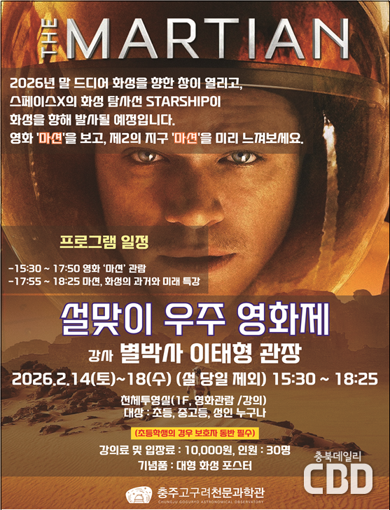 설 연휴 기간 오후 3시 30분부터 6시 25분까지 진행되는 ‘설맞이 우주 영화제’에서는 영화 마션을 함께 보고 영화 속 화성과 실제 화성에 대한 과학적 해설과 화성의 미래에 대해 별박사 이태형 관장이 직접 강연한다. 화성과 지구의 거리는 2년 2개월마다 가까워지며, 그때마다 화성 탐사선을 발사할 수 있는 창이 열리는데 올해 말이 그 창이 열리는 시기이다. 화성의 식민지 건설을 최종 목적으로 하고 있는 미국 스페이스 X는 올해 말 화성 탐사선 스타쉽의 발사를 예정하고 있다. 이번 마션 강연은 화성이 정말 제2의 지구가 될 수 있을지 인류의 미래에 대해 생각해 보는 시간이 될 것이다.