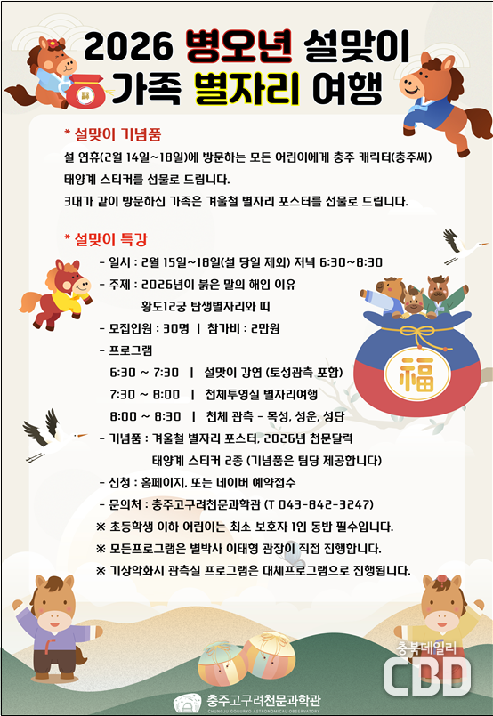 충주고구려천문과학관(이태형 관장)에서는 2026년 병오년 설 연휴를 맞이하여 ‘2026 병오년 설맞이 가족 별자리여행’을 개최한다. 설 연휴 기간에 충주고구려천문과학관의 관측 프로그램에 참여하는 모든 어린이에게는 충주 캐릭터(충주씨)로 만든 태양계 스티커를 선물로 제공한다. 특히 3대가 함께 방문하는 어린이에게는 대형 겨울철 별자리 포스터를 추가로 선물한다.