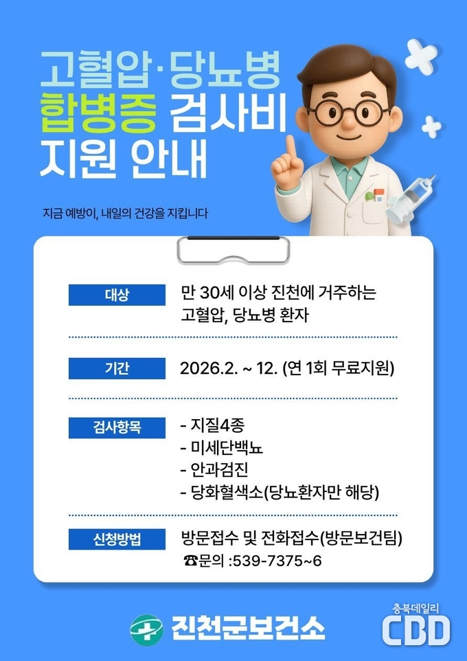 충북 진천군은 고혈압과 당뇨병 질환자의 합병증을 조기에 발견하고 체계적인 건강관리를 돕기 위해‘2026년 고혈압·당뇨병 합병증 검진 사업’을 실시한다고 11일 밝혔다.