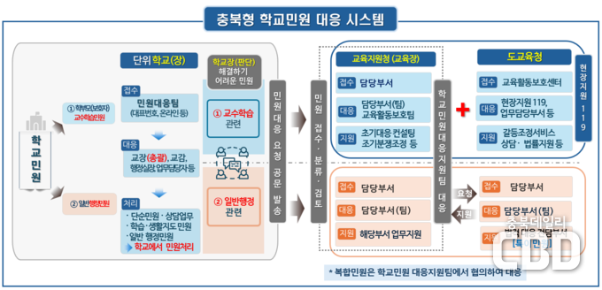 먼저, 학교의 특이(악성)민원에 대한 대응 체계를 강화한다. 충북교육청은 학교 민원을 교수학습 민원과 일반 행정민원으로 구분하고, 민원 처리의 원칙과 절차를 현장에서 공유할 수 있도록 <충북형 학교민원 대응 시스템>을 마련했다.