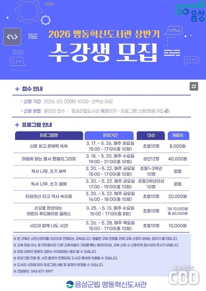 음성군 맹동혁신도서관이 ‘2026 상반기 문화교실’ 참여자를 모집한다.