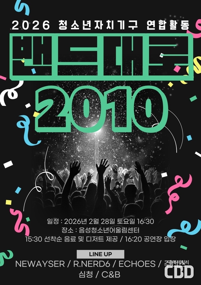 음성군은 이달 28일 음성청소년어울림센터에서 2026년 청소년자치기구 연합활동 ‘밴드대로 2010’을 개최한다고 밝혔다.