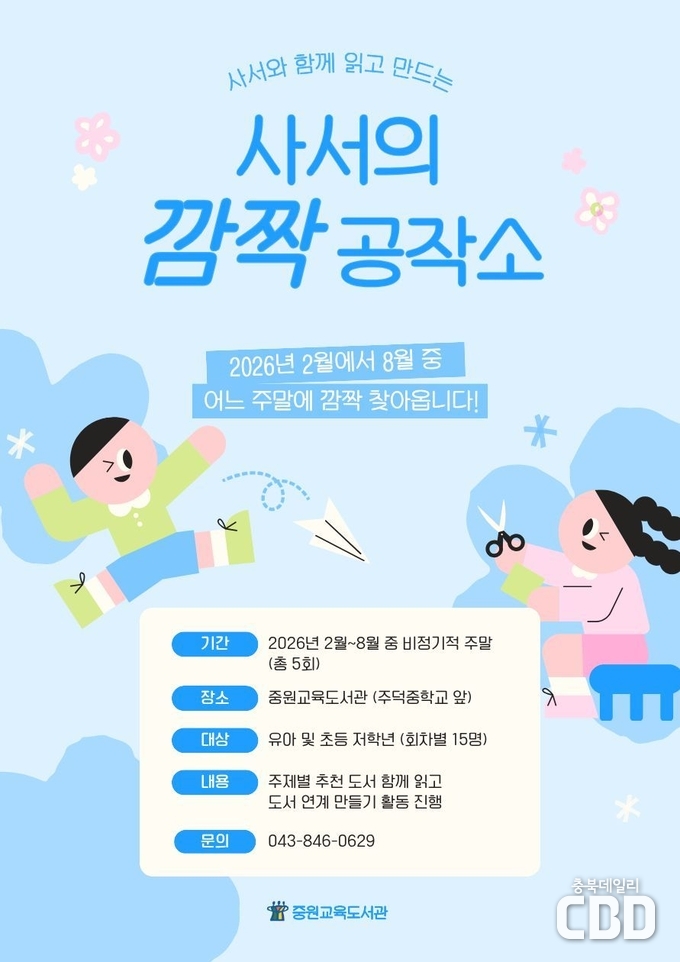 충청북도교육청 직속기관 중원교육문화원(원장 신기철)은 오는 28일(토)부터 8월 말까지 유아 및 초등 저학년을 대상으로 토요일 프로그램 <사서의 깜짝 공작소>를 총 5회 운영한다고 밝혔다.