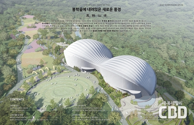 군에 따르면, 이번 설계 공모에는 총 3개의 작품이 접수됐다. 군은 지난달 26일에 열린 건축·목구조·조경전문가 7인으로 구성된 심사위원회에서 봉학골 정원의 지형과 경관을 살린 배치 계획 등을 종합 평가해 ㈜선엔지니어링 종합건축사사무소 작품을 당선작으로 선정했다.