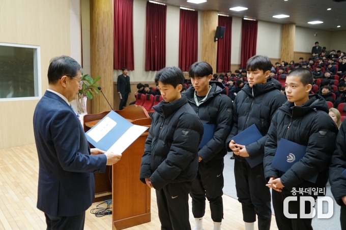 진천군청 직장운동경기부 육상팀이 지난 3일 충북체육고등학교 입학식에서 신입생들에게 우수 장학금 150만 원을 전달했다.