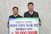 청주축협, 지역 소외이웃 위해 2천만원 상당 축산물 나눔 - 소고기 500㎏ 복지시설 지원 위해 후원 - 청주축산업협동조합(조합장 이종범, 이하 청주축협)은 2일 청주시청을 방문해 지역 소외계층을 돕는 데 써달라며 2천만원 상당 소고기(정육) 500㎏을 시에 기탁했다. 임시청사 직지실에서 진행된 기탁식에는 이범석 청주시장과 이종범 청주축협 조합장이 참석했다. 이번 기탁은 연말을 앞두고 지역사회에 따뜻한 나눔을 전하기 위해 마련됐다. 시는 기탁받은 소고기를 지역 내 사회복지시설 등에 전달할 계획이다. 이종범 조합장은 “지역사회와 함께하는 축협으로 소외된 이웃에게 작은 보탬이 되고자 이번 나눔을 준비했다”며 “앞으로도 지속적인 사회공헌 활동을 이어가겠다”고 말했다. 이범석 시장은 “청주축협의 따뜻한 나눔이 지역사회에 큰 힘이 될 것”이라며 감사를 표했다. 한편 청주축협은 매년 소외된 이웃을 위해 고기, 축제 입장권 등의 물품을 후원하며 나눔문화 확산에 기여하고 있다.