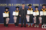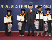 배움의 열정으로 빛난, 청주시민대학 명예학위 수여식 개최 - ‘청주시민대학 교육과정 100시간 수료’ 명예 학사 5명 배출 - 청주시가 시민들에게 수준 높은 평생교육 과정을 제공하기 위해 운영 중인 청주시민대학이 22일 두 번째 명예학사를 배출했다. 청주시평생학습관은 이날 대강당에서 ‘청주시민대학 명예학위 수여식’을 열고 박연숙 씨 등 5명에게 명예학위를 수여했다. 수여식에는 이범석 청주시장을 비롯한 시 관계자, 김현기 청주시의회 의장, 평생학습 수강생과 동아리 회원, 강사 등 100여명이 참석해 수상자들을 축하했다. 민선 8기 청주시 공약사업으로 2023년 9월 개교한 청주시민대학은 대학교수, 의사, 예술가, 연구원 등 각 분야 전문가를 강사로 초빙해 연간 40개 강좌 이상의 대학 수준 평생학습 프로그램을 운영하고 있다. 명예학위는 필수과정인 ‘청주학’과 ‘시민학’을 포함해 청주시민대학 교육과정을 100시간 이상 이수한 학습자에게 수여되는 비공인 명예 학사 학위다. 지난해 첫 명예학사를 배출한 데 이어 두 번째로 열린 이번 수여식에서는 총 5명이 명예학사 학위를 받았다. 이 가운데 가장 많은 학습 시간을 이수한 이헌희 씨
