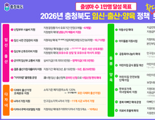 ‘출생아 수 1만 명 목표’ 충북도, 출산·돌봄·양육 안심 3종 패키지 가동 - 출생아 수 증가율 1위, 출생아 수 8천 명 돌파, 반등세 이어간다 - - 출산 이후 돌봄·양육까지 이어지는 생애 주기 ‘안심 설계’ - 충북도는 ‘2025년 출생아 수 증가율 전국 1위’와 ‘출생아 수 8천 명 돌파’라는 상승세를 바탕으로, ‘출생아 수 1만 명’ 실현을 목표로 2026년 임신·출산·양육 정책을 확대 추진한다고 밝혔다. ※ ‘25년(1~12월) 출생아 수 증가율 전국 1위(충북 9.1%, 전국 6.6%) ※ 민선8기 최초 출생아 수 ‘8천 명’ 돌파(’25년 출생아수 8,336명) * 출처 : 행정안전부 주민등록 출생통계 충북도는 그간 결혼·임신·출산·돌봄·양육 전반에 걸친 촘촘한 정책 추진으로 전국적인 저출생 상황 속에서도 출생아 수와 합계출산율의 동반 상승을 이끌어냈다. 충북도는 이러한 긍정적 흐름을 확고한 반등구조로 이어가기 위해, ‘출산·돌봄·양육 안심 3종 패키지’를 중심으로 도정 역량을 총동원할 방침이다. 임신·출산 건강 안심 : 임신 준비부터 산후 회복까지 전 주기 지원 충북도는 임신을 준비하는 단계부터 출산에